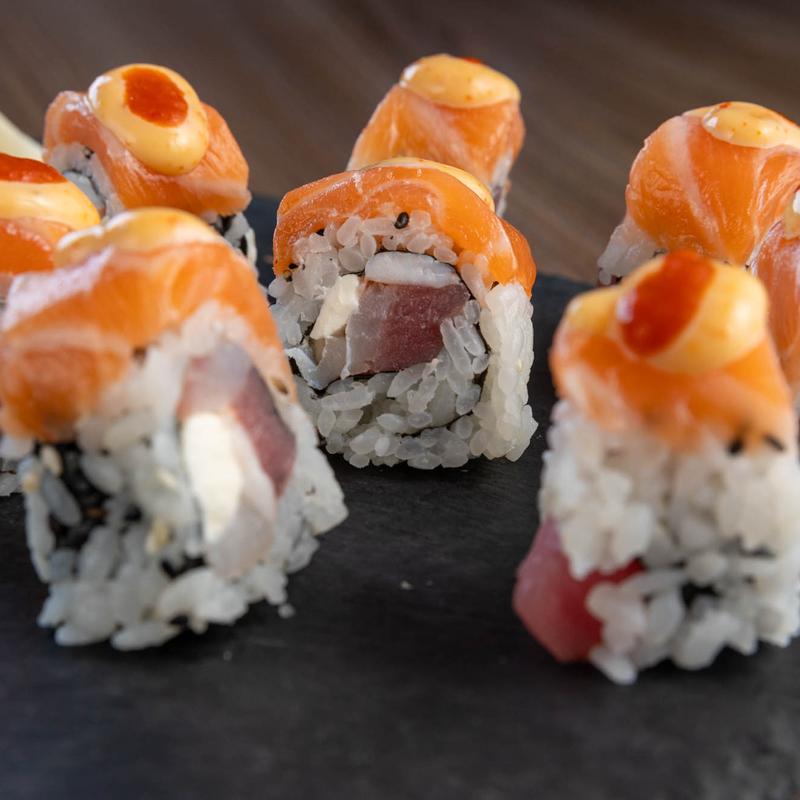 Tuna, red snapper, yellowtail topped with salmon and spicy mayo