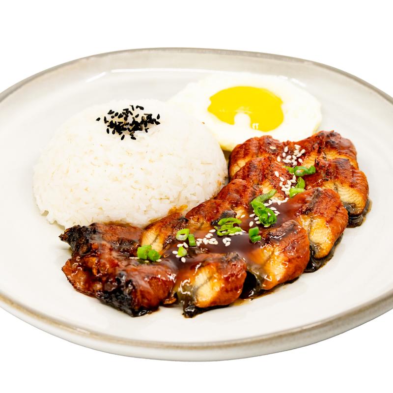 Grilled eel glazed with rich unagi sauce, served with pan-fried egg and white rice