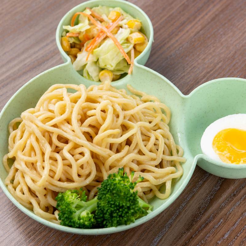 Chicken nuggets, soy sauce-based plain noodles, assorted seasonal vegetables and pumpkin pancake