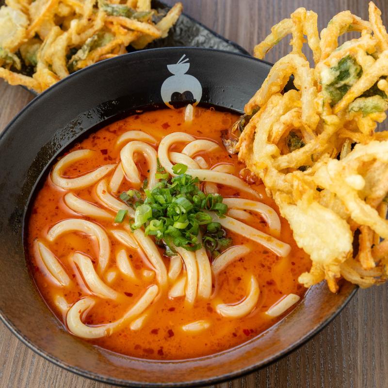 Eiwa spicy vegetable broth, Udon noodles, vegetable Kakiage, scallion and sweet corn | Option: Tokyo-style wavy noodles | Hakata thin noodles
